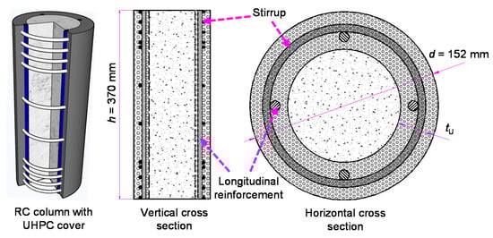 Ultra-high-performance concrete (UHPC) has been extensively investigated and is widely used in practical engineering, owing to its excellent mechanical properties, such as its high elastic modulus, high compressive and tensile strength, and strain hardening in tension. Many novel components and structures consisting of UHPC have been developed, such as the steel-UHPC composite deck system, delay-casted UHPC wet joint in bridge decks, and so on [1,2,3,4]. With the application of UHPC, the crack resistance and load-carrying capacity of these components are significantly improved. However, most UHPC applications mainly focus on the material’s tensile strength and strain hardening in tension. Therefore, the advantage of high compressive strength has not been fully exploited. To extend the application of the compressive strength of UHPC, Zeng et al. (2020) investigated the compressive behavior of full-scale reinforced UHPC columns, and proposed a strain–stress model for the reinforced UHPC columns [5]. The test results revealed that the tensile strength of the UHPC material contributed the most to its confining effect, while the confining effect from the stirrup was relatively small. However, the column exhibited brittle failure even for the specimen with the volumetric ratio of 0.13, which is evidently higher than the minimum value (0.08) required by Eurocode 8 [6]. The full-section employment of UHPC significantly contributed toward complete brittle failure under compression and increased the cost of the structure.