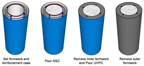 The construction process of the composite column is shown in Figure 2. First, the two layers of formwork and the reinforcement case were set. Then, the inner NSC core was poured. After the initial setting of NSC, which is typically two days, the inner formwork was removed, and the exterior UHPC was poured. Finally, the outer formwork was removed. Obviously, the pouring sequence for the inner NSC core and exterior UHPC cover could be reserved, and this reversibility was considered one of the experimental parameters.