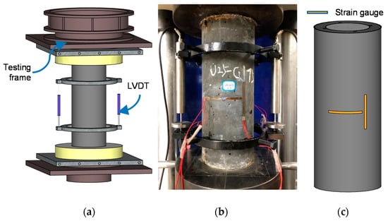 The loading setup and measurement system is shown in Figure 4. A displacement-controlled compression testing machine was used. In the compression test, the strain rate was set to 2.3 × 10−5 /s according to the requirements specified by the Chinese concrete strength standards [12]. The axial load was applied on both UHPC cover and NSC core. Two linear variable differential transformers (LVDTs) were used to monitor the specimens’ axial deformation. Four strain gauges were pasted at the middle of the height of each specimen to measure the vertical compression and circumferential expansion.
