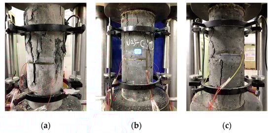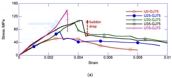 The failure modes of U0-GJ75, U25-GJ75, and U76-GJ75 are shown in Figure 5. The reinforced NSC column exhibited similar failure modes as those observed in many previous studies. The vertical crack appeared in the middle area, and gradually developed through the entirety of the specimens. Additionally, the specimens lost their load-carrying capacity owing to the large-scale spalling of NSC. The reinforced UHPC column exhibited brittle failure soon after achieving its peak load, which is consistent with the test results by Zeng et al. (2020) [5]. For the composite column, the initial crack occurred on the UHPC surface at the peak axial load. Immediately after the peak load, the crack vertically run through the exterior UHPC cover. Unlike the reinforced UHPC column, the composite column did not completely lose its load-carrying capacity after the vertical crack penetration. Compared with the reinforced UHPC column, the crack of the thin UHPC cover could not instantly release excessive energy, and the stirrup maintained the confinement for the core area. Thus, owing to the confinement from the stirrup, the composite column could still carry a certain axial load. However, the load-carrying capacity obviously decreased.