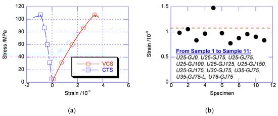 The circumferential tensile strain (CTS) and vertical compressive strain (VCS) of U35-GJ75 are compared in Figure 6a, wherein the compressive strain is shown to be positive. Before achieving the peak confined stress, the CTS developed proportionally with the VCS. This result reveals that there was good linearity before the peak confined stress. At the peak confined stress, the CTS of U35-GJ75 was 0.98 × 10−3, which is close to the ultimate tensile strain of the plain UHPC. Figure 6b shows the CTS at the peak confined stresses for all the composite columns, which was close to the ultimate tensile strain. For a cylinder consisting of a material with tension strength, which was much less than the compression strength, the essence of compressive failure is that the circumferential tensile stress at the edge achieves tension strength [5,13]. This conclusion is also supported by the CTS development in the composite column at peak strength.