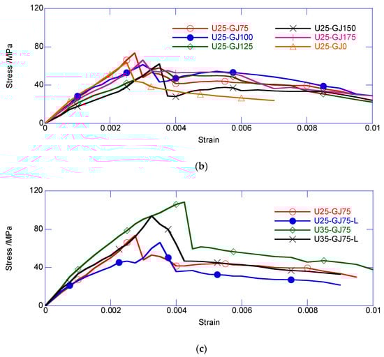 Figure 7a compares the effects observed with different thicknesses for the exterior UHPC cover. The initial stiffness of the five specimens was similar. The U76-GJ75, that is, the reinforced UHPC column, had the largest confined strength, but underwent completely brittle failure. Compared with U0-GJ75, the obviously thicker UHPC cover led to a higher average confined stress. The enhancement mainly resulted from the larger UHPC area and stronger confinement for the inner NSC core. Moreover, the specimen with a thicker UHPC cover underwent a large sudden decrease. After the sudden decrease, the ring UHPC cover was split into multiple UHPC prisms connected through stirrups. Each UHPC prism could still carry the axial load. Thus, the specimen with a thicker UHPC cover had a larger residual confined stress after the sudden decrease. In the post-decrease stage, the confined stress of all the composite columns gradually decreased at a similar rate until failure.