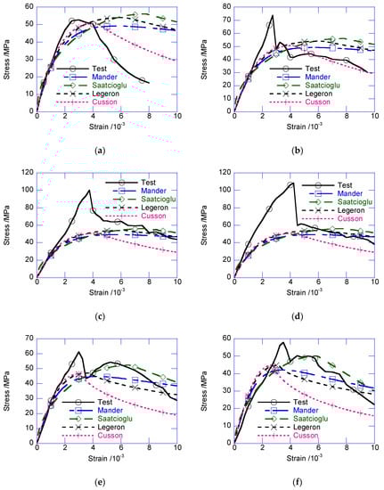 Figure 8 compares the strain–stress relationships with those of classical confined concrete models [14,15,16,17]. Note that, the confined stress of the composite column was the average stress, not specific for the NSC core or UHPC cover. According to the test results, before the peak confined stress, the test results delivered much higher confined stress than the prediction obtained using these models. The participation of the exterior UHPC cover in load-carrying significantly enhanced the peak confined strength. Moreover, the sudden decrease of the composite columns was reflected in the confined models.