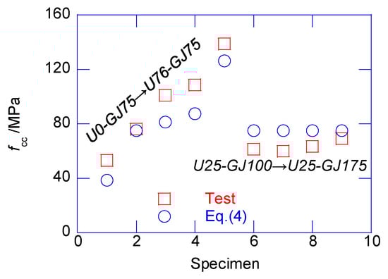 where fco_U and fco_N are the compressive strengths of the plain UHPC and NSC, respectively, as presented in Table 3; and are the area ratio of the UHPC and NSC to the total confined area, respectively, as expressed in Equation (5); fl is the confining stress and is the confining coefficient, which must be different to the confined NSC column when using UHPC-NSC composite columns.