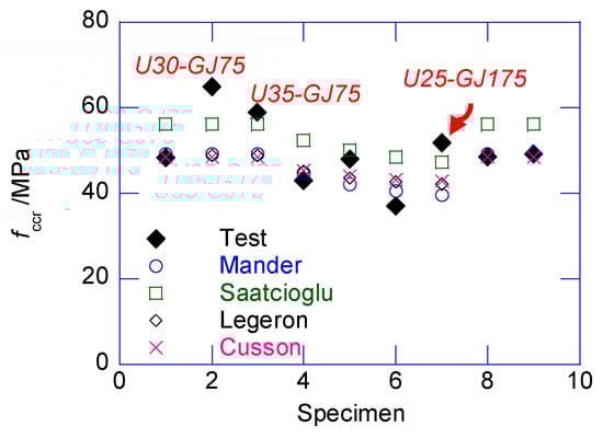 In the post-peak stage, the strain–stress relationship returned to the covered range of the classic models. The confined stress after the sudden decrease only approximately agreed with the peak confined strength predicted by several classical models. After the sudden decrease, the circumferential tensile stress in the UHPC cover disappeared. The cracked UHPC cover, which existed as multiple independent UHPC prisms, bonded with the inner NSC core, which transferred the confining stress from the stirrup. At this stage, the UHPC prisms can be considered the NSC material, owing to the negligible circumferential tensile strength. Thus, the confined strength after the sudden decrease can be considered as the peak confined strength of the NSC column. By ignoring the tensile strength of UHPC cover, and substituting the design parameters in the classic confined NSC models, such as the Mander, Saatcioglu, Legeron, Cusson models, the post-drop strength of the composite column can be derived, as presented in Figure 12. The average prediction errors of the Mander, Saatcioglu, Legeron, Cusson models are −4.98%, 8.10%, −17.26%, −4.86% respectively. The Mander model delivered the best prediction. Except for U30-GJ75, U35-GJ75, and U25-GJ175, after the sudden decrease, the confined stress was located in the cover of several classical models. After the sudden decrease, the compressive strain was approximated using Equation (7), where 0.23 × 10−3 is the average value of obtained in this test.