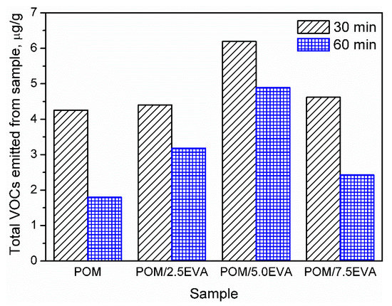 It can be seen that the volume of emission strongly depends on the content of EVA. Such an effect is associated with higher emissions related to neat EVA when compared to POM [32]. The highest emissions were observed for 5.0 wt.% content of EVA. However, for all contents, emissions are relatively at similar levels. Moreover, values of the TVOCs parameter obtained after two times of sample conditioning are presented in Figure 2. Before the analysis, samples present in chambers were purged with gas to stabilize the analysis conditions. It can be seen that the conditioning of samples for a longer time significantly decreases the emission level, which indicates that the majority of VOCs are emitted during the first 30 min of analysis. Such an effect can be exciting and essential for the potential applications of analyzed materials because proper postproduction treatment of the product may significantly reduce its environmental impact. Considering the more and more pronounced issues of the environmental aspects of different processes and products, the influence of sample conditioning on the VOC emission should be investigated in further studies.