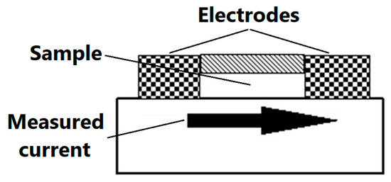 The purpose of electrostatic measurements is to determine the characteristics of the tested object, namely the state (degree) of electrification or antistatic properties. Both of these features are associated with the intensity of the electric field, which is the fundamental parameter used to describe the electric field surrounding electrostatic charges. Electrical resistance is defined as the quotient of DC voltage and current. The object resistance is the quotient of the DC voltage applied to the tested object and the current flowing between the electrodes through the tested object. Resistance results from the relationship described by Ohm’s law. The surface resistance is the electrical resistance of the material expressed in ohms, measured between the measuring electrodes on the same surface of the material being tested (as shown in Figure 3)—following relevant standards [48].