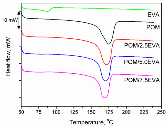 Figure 4 shows the DSC curves obtained during the second heating of the samples. It was noted that despite the significant differences in melting temperatures of raw materials, the addition of EVA to POM did not significantly affect the melting point. The onset was determined to be around 158–159 °C in all cases, while the maximum melting peak was recorded in the range of 168–175 °C. With the increase of EVA content, melting temperature (Tm) was shifted from initial 174.75 °C to 168.70 °C for 7.5 wt.% addition of EVA, through 171.66 and 170.19 °C for 2.5 and 5.0 wt.%, respectively. A similar effect was noted in other works [51]. Enthalpy of melting was decreasing with the increase of EVA content and was in the range of −92.97 to −101.30 J/g. For 3D printing, the performed modification of POM should not affect the printing parameters. The only possible change may be a slight lowering of the printing temperature, which may affect the solidification of material and adhesion of the print to the table.