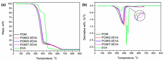 The curve observed for thermal decomposition of EVA is typical for this material; similar results, indicating three-step decomposition, were observed by other researchers [53]. The first step is associated with the degradation of the vinyl acetate phase and results in the generation of acetic acid. The second step is related to the chain scission of the ethylene phase. The values of mass loss for these steps are associated with the vinyl acetate content in EVA. In Figure 5b, it can be seen that modification of POM with EVA and presence of the ethylene phase results in the slight change of decomposition course, which is more pronounced for rising EVA content. The third step, observed at temperatures over 465 °C, is due to conditions of analysis, particularly the application of synthetic air as atmosphere gas [53].