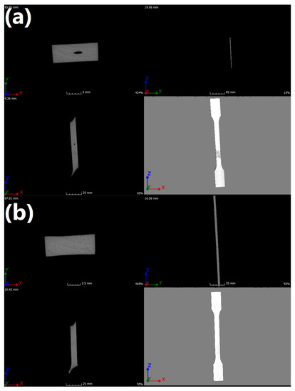 The dogbone ISO 527-2-1A specimens were imaged using X-ray microcomputed tomography (μCT) (v|tome|x s, GE Sensing & Inspection Technologies, phoenix|x-ray, Wunstorf, Germany). The samples were placed on the polymer stand and scanned at 180 kV with a current of 2000 μA. One thousand scans of each sample were obtained at a total scan time of 150 s—the established scan parameters allowed to register an optimal contrast of the image with 10 μm resolution. To identify changes in the microstructure of the analyzed samples, the acquisition of micro-CT projections was carried out in an 8-bit greyscale. Image acquisition was carried out using the micro-CT system (GE Sensing & Inspection Technologies, Wunstorf, Germany), providing a sequence of 2D images. The reconstruction and visualization were conducted using VGStudio MAX 2.1 software (Volume Graphics, GmbH., Heidelberg, Germany).