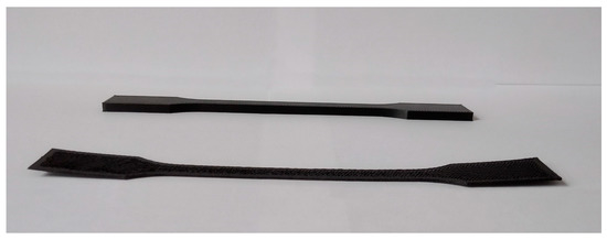 The extruded 3D-printing filament with a diameter beyond the tolerance range of 2.85 ± 0.05 mm due to the limitation of the twin-screw extruder and original filament collection system was printed on modified 3D printers, allowing the use of a wide range of diameters with reduced print quality. ISO 527-2-1A specimens were printed with each material ten times. The results of the performed tests are presented in Table 10 and Figure 7.