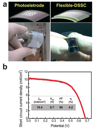 Flexible photoelectrode and DSSC fabricated by the APP process. (a) Schematic illustrations and real photo images of the flexible TiO2 photoelectrode and DSSC based on a tin-doped indium oxide (In2O3:Sn)-coated polyethylene naphthalate substrate. (b) Current density–voltage characteristics of the flexible DSSC under 1 sun illumination. The photovoltaic properties (JSC—the short-circuit current density, VOC—the open circuit voltage, FF—the fill factor, and η—energy conversion efficiency) of the flexible DSSC with a TiO2 film thickness of 3 μm are summarized in the inset of (b). Republished with the permission of the Royal Society of Chemistry, from [22]; permission conveyed through Copyright Clearance Center, Inc.