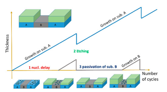 Schematic of an atomic layer selective deposition process as an alternative method for three-dimensional patterning. The supercycle consists of three steps, in which (1) nucleation times on two substrates (A and B) differ due to different surface chemistries on each surface; (2) a precise and selective plasma etching process is used to remove undesired growth on substrate B; and (3) chemical passivation is used to prevent material growth on substrate B. Reprinted with permission from [69]. Copyright (2019), American Vacuum Society.