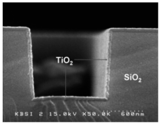 Cross-sectional SEM image of a TiO2 thin film obtained using PEALD on a patterned SiO2/Si surface maintained at 200 °C. Reprinted from Park et al. [67]. Copyright © 2004 Taylor & Francis Group.