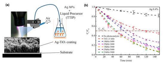 In Fakhouri et al.’s recent work [16], a precisely controlled and porous TiO2 film grown on membranes using APPJ was compared with a nonporous thin film deposited by rf magnetron sputtering with respect to PEC and photocatalytic activities. On the one hand, a thin film grown by APPJ showed better photocatalytic activity, inducing rhodamine B (Rh.B) dye (i.e., a fluorescent material) degradation more effectively in the presence of TiO2 with elevated porosity under white light irradiation than in the sputtered deposited film. On the other hand, the PEC responses were superior for rf magnetron-sputtered deposited film [16]. Similarly, Rh.B was used to investigate the photocatalytic activity of nano-Ag–TiO2 coatings deposited by APPJ (Figure 9) [112]. By combining the APPJ with a spraying system, high deposition rates were achieved in the range of 10–20 μm/s. Using this method, large photocatalytic activities were measured for coating from solutions with 0.3% and 0.4% Ag concentrations in TTIP. In this study, the authors concluded that pulse frequencies had a negligible effect on Rh.B degradation, whereas lower air flow rates induced a faster kinetics because such conditions caused higher crystallinity of the coating [112].