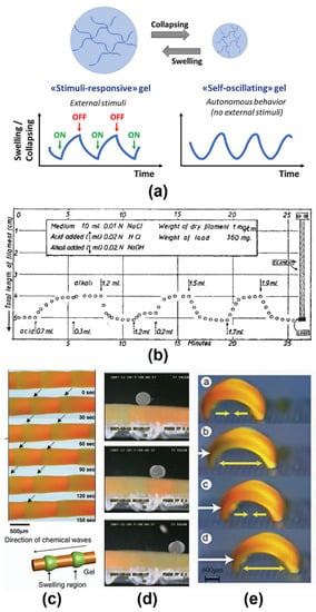 In the 1940s, Katchalsky et al. studied the development of artificial systems able to convert chemical free energy directly into mechanical work []. It was reported that chemo-mechanical transduction under isothermal conditions could be obtained as a result of phase transitions in both artificial (e.g., poly(acrylates)) and natural (e.g., collagen []) polymers induced by differences in pH [,] or salt concentration [] (Figure 1b). Nevertheless, breakthroughs in the field could be achieved only decades later, when Yoshida and collaborators coupled hydrogels with oscillating reactions [], giving birth to the development of the fertile field of self-oscillating polymer systems [,,].