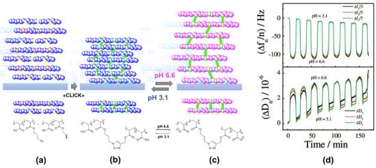 In 2008, Tang et al. reported the oscillatory behavior of a pH-responsive LbL assembly, which was studied by means of QCM-D []. The multilayer was assembled by the assembly and “click” reaction of poly(acrylic acid-co-3-azidopropyl acrylate) (poly(AA-co-Az)) and poly(acrylic acid-co-propargyl acrylate) (poly(AA-co-PA)) directly on the QCM crystal resonator, which was previously functionalized with a primer layer of alkyne-modified branched poly(ethyleneimine) (Figure 3a). The crosslinking points guaranteed the mechanical stability of the assembly during the oscillations, preventing its detachment (Figure 3b,c).