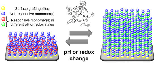Polymer chains which are attached by one end to a surface, when a high enough density coverage is achieved, stretch away from the substrate to reduce their excluded-volume interactions. Such structures are called “polymer brushes” [,] and have been the subject of intensive theoretical studies for decades, before polymerization techniques became refined enough to allow their thorough experimental exploration. If the chain growth proceeds directly from the substrate, which is what happens when initiators are grafted on a surface, the approach is called “grafting-from” to distinguish it from “grafting-to” (in which pre-formed chains are adsorbed or covalently bound to a surface). Design possibilities have been enriched by the introduction of controlled radical polymerization techniques, such as nitroxide-mediated radical polymerization (NMP), reversible addition fragmentation chain transfer (RAFT) and atom transfer radical polymerization (ATRP) [,]. Polymer brushes have since then been exploited for developing functional surfaces with tunable properties in response to external stimuli [,,,,,,,,,,].