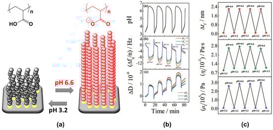(a) Schematic representation of pH-responsive poly(acrylic acid) brushes. (b) The observed shifts in frequency and dissipation caused by pH oscillations. (c) Deducted changes in brush thickness, shear viscosity and elastic shear modulus. Reproduced with permission from [], American Chemical Society, 2008.