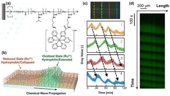 (a) Structure of the grafted-from self-oscillating polymer brushes (SOPB). (b) Schematic representation of the propagation of a chemical wave in the SOPB. (c) Top: fluorescence microscopy images of a glass capillary modified with the SOPB; bottom: oscillating profile of fluorescence intensity for each SOPB position. Adapted and reproduced with permission from [], Wiley, 2013. (d) Spatiotemporal pattern of chemical wave propagation in a SOPB (adapted and reproduced with permission from [], American Chemical Society, 2015). In both (c,d) the Belousov–Zhabotinsky (BZ) reaction conditions were: [HNO3] 0.81 M, [NaBrO3] = 0.15 M, [malonic acid] 0.1 M.