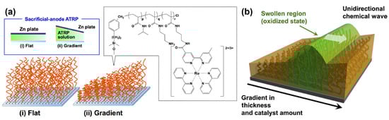(a) Preparation of flat and gradient self-oscillating polymer brushes by sacrificial anode ATRP. The chemical structure of the oscillating polymer is shown in the inset. (b) Illustration of the self-oscillating gradient polymer brushes showing the unidirectional propagation of chemical waves generated by the Belousov–Zhabotinski reaction. Adapted and reproduced from [], American Association for the Advancement of Science, 2016.