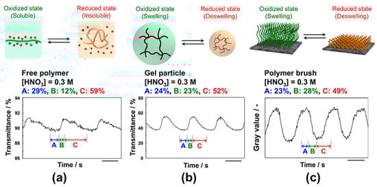 Differences in the oscillation waveforms observed for (a) free polymer chains, (b) gel particles, and (c) polymer brushes. The concentrations of the BZ reaction substrates were as follows: [HNO3] = 0.3 M, [NaBrO3] = 150 mM, and [malonic acid] = 100 mM. The scale bar is 50 s in all plots. Adapted and reproduced with permission from []. American Chemical Society, 2018.