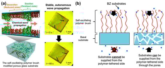 (a) Schematic representation (left) and experimental observation (right) of self-oscillating polymer brushes grown from porous glass. (b) Illustration of the different supply mechanism of BZ substrates to polymer brushes. In the case of a non-porous substrate, the BZ substrates can only be supplied from the free-end of the polymer brush, while with a porous substrate they can be supplied efficiently both from the free-end and the tethered-end. Adapted and reproduced with permission from [], American Chemical Society, 2019.