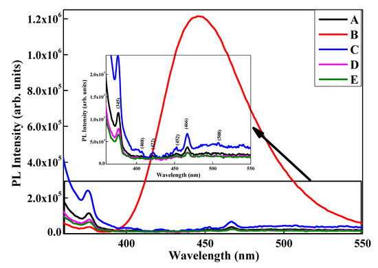 - Fujihara, S.; Ogawa, Y.; Kasai, A. Tunable visible photoluminescence from ZnO thin films through Mg-doping and annealing. Chem. Mater. 2004, 16, 2965. [Google Scholar] [CrossRef]