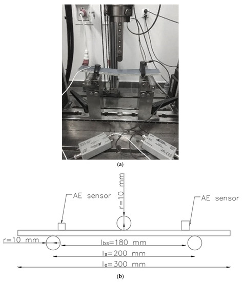 The fiber–cement element in three-point bending with installed AE sensors: (a) photograph of the specimen; (b) scheme of loading and AE sensors.