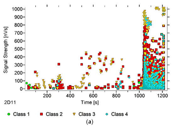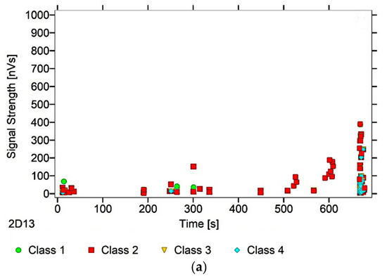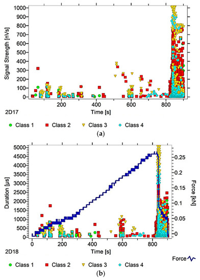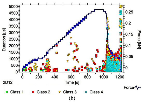 After dividing the recorded AE signals into four classes, using k-means algorithms, two AE parameters were analysed (as an illustration of ongoing processes)—signal strength and signal duration. The number of classes was input by the authors into the software used to analyse the AE signals. The value adopted corresponds to the nature of the material’s work, and allows us to link individual classes with specific processes. Another criterion explaining the imposed number of classes was the level of individual signals matched to the appropriate classes, which in this case was over 90%. The following individual AE signal classes were assigned to processes occurring in the structure of the tested material: