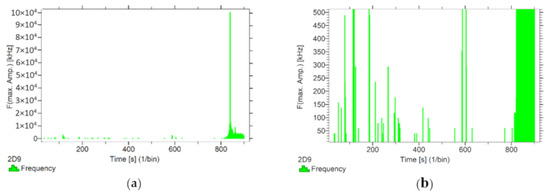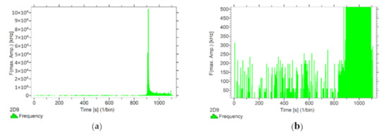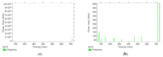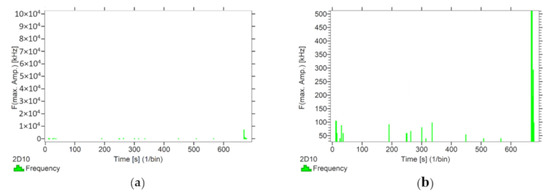 Frequency distribution graph during the test of the mock BC sample: (a) taking into account the entire frequency range; (b) specifying the frequency range before destruction.