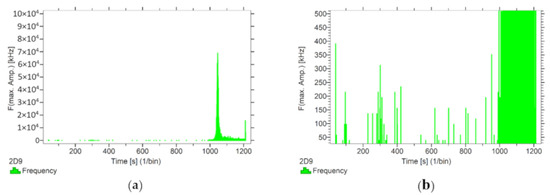 Analysing the graphs presented above, it can be concluded that the results from subjecting the tested components to two groups of operating factors (environmental and exceptional) illustrated significant differences in the emitted frequency ranges. Changes in the mechanical parameters of the samples in the air-dry state, water-soaked and cyclically frozen then defrosted under an external load, are associated with low and high frequency signals. Most of the recorded frequencies exceed the 200 kHz threshold, and some events produce sounds of 300–500 kHz. The situation is different for flamed and fired samples. The bending of components exposed to high temperatures caused events at much lower frequencies, only some of which exceed 100 kHz.