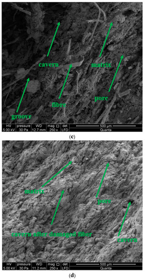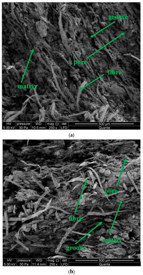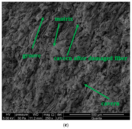 Based on the analysis of the results shown in Figure 13, it should be concluded that the macrostructure of each of the analysed board samples before microscopic examination was determined, visually, as compact. Microscopic observations determined that the structure of the samples were fine-porous, with pore size up to 50 µm. Deep grooves of up to 500 µm in width were found on the fracture surfaces. A high density of irregularly distributed cellulose fibers was observed at the tested fractures (Figure 13a–c), except for the flamed sample and the fired sample. In the burned sample, it was observed that most of the fibers are fired or blended into the matrix. Flaming causes gradual burning of fibers, and the degradation of their structure, depending on the flame range (Figure 13d,e). Caverns and grooves from the torn fibers were observed. The matrix structure is defined as granular with numerous delaminations. No space was observed between the fibers and the matrix, indicating a strong bond between them. In the analysis of the flamed sample (Figure 13d) a locally altered matrix structure was observed.
