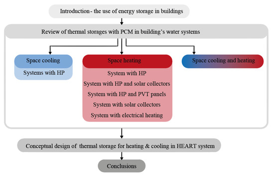 Several studies have already analyzed the use of PCMs as a storage medium in cooling systems. An extensive review of PCMs in terms of material properties, encapsulation and heat transfer enhancement was carried out by Li et al. [32,33]. There is a number of studies focusing on ice [34,35,36] and the outcomes are positive, meaning that the inclusion of ice brings energy savings [37,38]. However, PCMs with higher melting temperatures are more suitable to work with standard air-conditioning systems because they are able to work with heat transfer fluid (HTF) temperatures above 0 °C. Thus, according to [39], PCMs with a melting/solidification temperature around 8 °C are suitable materials for these applications. In the following chapter, systems with HP in connection with PCM are analyzed, whereas solar energy systems are presented separately, since they usually provide both heat and cold. There are also other technologies, such as direct evaporative cooling [40] or dry coolers [41,42], but their review will be omitted because here the focus is on HP and solar energy.