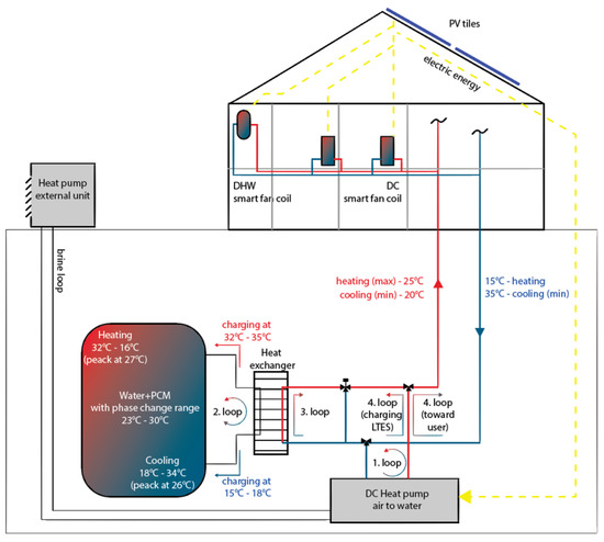 More in detail, the HEART (Holistic Energy and Architectural Retrofit Toolkit) project, funded in the context of H2020-EU.2.1.5.2 [14], introduces a technological advancement beyond the current state-of-the-art, by proposing system innovations used in a holistic approach to the energy retrofit of residential buildings. In particular, it aims to maximize the self-consumption of RES in existing residential buildings, by coupling a PV system with DC-HPs that are connected with a TS system (Figure 2). The latter is thus able to store the excess of PV energy as a thermal form of energy at a low temperature, which can be exploited later, as needed. This allows a reduction in the mismatch between solar radiation and thermal loads. It is critical to emphasize that the heat or cold produced in a centralized DC-HP is stored at low temperature in the TS unit, since each apartment contains a small-size fan coil with a DC compressor (local HP), used to increase the thermal power (coming from the centralized HP or LTS), according to the thermal demand of each room. This allows to minimize heat losses in the existing distributions pipes, in order to avoid condensation in the cooling mode and to increase the COP/EER of the centralized HP.