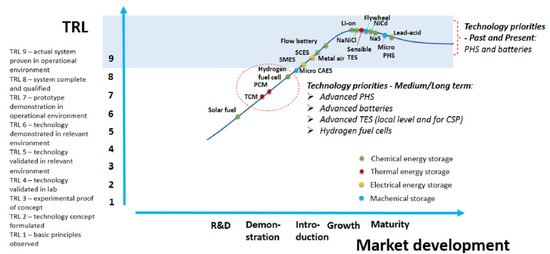 The technology maturity curve in Figure 3 consists of the technology readiness level (TRL) and the stage of market development of energy storage technology for small-scale energy systems. Nguyen et al. [75] obtained TRL results by examining different reviews of energy storage technologies and marked the current state of technology development. Furthermore, the stages of market development are evaluated according to research and development, demonstration, growth and maturity. Figure 3 shows that in TS technology, STS is currently the most mature technology for small-scale energy systems. Hybrid systems with macro-encapsulated PCMs integrated in a water TS tank for increasing energy density are in the demonstration stage, and some of them have already been introduced on the market. PCMs are mostly chosen based on cost, but further advancements are possible in this area, according to several research projects [74]. According to the Roadmap towards 2030 of the European Energy Storage Technology Development [76], a further research and development of PCMs should focus on new materials for the LTS, on the improvement of the thermo-physical properties of PCMs, on the identification of advanced heat transfer mechanisms for charging and discharging and on the development of advanced HTFs for thermal electricity storage systems combining heat transfer and heat storage. Furthermore, EASE states that the target for the technology is to have in 2030 a specific investment cost below 50 EUR/kWh for compact latent heat and thermo-chemical storage.