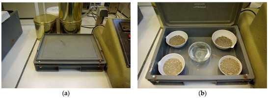 In order to measure the water content of the raw materials, the samples were stored in the laboratory at a constant temperature and hygrometry (21 °C and 60% relative humidity) for at least 1 month (as close as possible to the “natural” conditions). The water content of samples reaching constant state at laboratory condition was determined using the European standard EN 1097-5 [60]. After the drying operation in the oven at a temperature of 105 °C, the representative samples were placed in a closed box containing water (Figure 1) in order to determine their capacity of water capture from atmospheric air (the external temperature and humidity were set at 20 ± 3 °C and 60 ± 10%). This original test is very important with regard to the behaviour of road foundation in case of freezing. Moreover, higher water capture is related to a higher amount of fine particles. The mass variation of the samples was regularly registered.