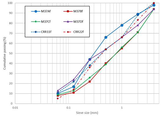 Raw materials (M84), recycled materials after treatment (M37) and recycled materials after compaction (CRR11) were sieved and divided into eight different grades (Table 2).