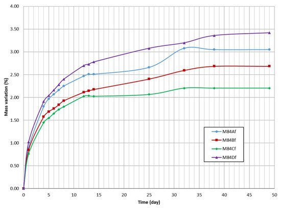 The mass variation of the samples at laboratory condition is shown in Figure 5. The result showed a larger increase in mass over time for sample M84Df than for sample M84Cf. M84Df sample contains higher amount of small particles, which can induce the creation of pores and favour capillary water absorption. During the first week, the mass increase of the powders was the most consequent. This parameter still increased in the following weeks, but, less importantly, the mass of the different samples continues to progress but much more slowly. It is noteworthy that the results obtained are not correlated with the previously calculated water content. In fact, the M84Bf sample, which has the highest value in terms of humidity, has a lower mass gain vs the two other samples. Even more surprising, M84Af, which has a relatively large mass gain, offers the lowest water content.