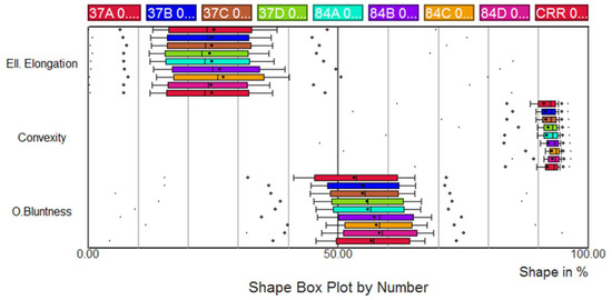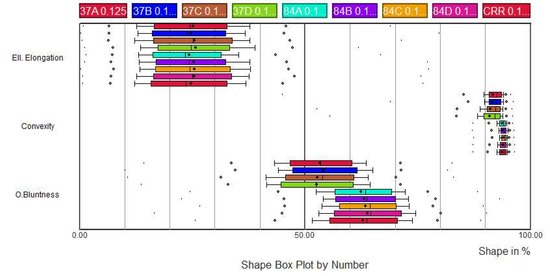 Shape analysis of particles (2–4 mm) (84 refers to raw materials: 84A, 84B, 84C and 84D refer to M84Af, M84Bf, M84Cf and M84Df, respectively; 37 refers to recycled materials after treatment: 37A, 37B, 37C and 37D refer to recycled materials after treatment M37Af, M37Bf, M37Cf and M37Df, respectively; CRR refers to recycled materials after compaction: CRR11f).