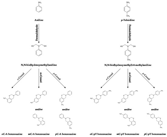 Syntheses of six cresol-based benzoxazines were performed according to a two-step Mannich reaction in toluene (Avantor Performance Materials Poland S.A., Gliwice, Poland). In the first stage, formaldehyde (34 mass % solution—Merck KGaA, Darmstadt, Germany) reacted with an amine (aniline, p-toluidine—Merck KGaA, Darmstadt, Germany) at reduced temperature to form N,N-bis(hydroxymethyl) amine, which, in the further step, forms benzoxazine after the addition of cresol isomer (Merck KGaA, Darmstadt, Germany). Molar ratio of the amine to formaldehyde to cresol was equal to 1:2:1, respectively. Reagents used for individual syntheses are listed in Table 1 and the schematic course of syntheses is presented in Figure 1.