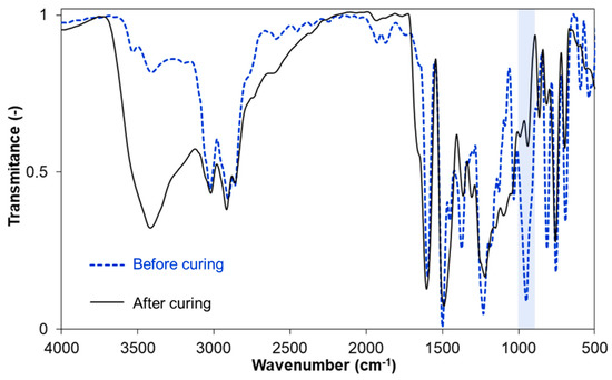 In all spectra, a series of characteristic signals can be observed. Absorption bands assigned to C–Har stretching vibrations appeared at 3014–3070 cm−1. C–Hx stretching vibrations from aliphatic (methyl and methylene) groups are present at 2914–2893 cm−1. Absorption of C=Car appeared at 1585–1612 cm−1 and 1467–1512 cm−1. Signals from the benzoxazine structure were observed at 1217–1253 cm−1 (asymmetric stretching C–O–C) and at 931–950 cm−1 (oxazine ring –O–C–N–) [33]. After curing in a furnace at 200 °C for 5 min, the signal at ~950 cm−1 disappeared in all samples, which additionally confirms the occurrence of ring-opening polymerization.
