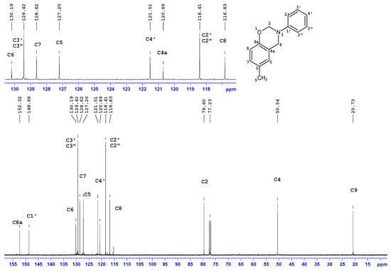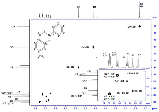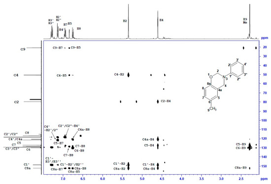 In the 13C NMR spectra, most of the 13C signals were observed in aromatic regions (~154–116 ppm), and among them, the greatest (8–11 ppm) downfield changes of chemical shift concern quaternary carbon, i.e., C6-C8 in the phenyl ring substituted with methyl. Two 13C signals at 50.5 ± 0.3 ppm and 79.8 ± 0.3 ppm correspond to C2 and C4, respectively. The structure of the benzoxazine moiety was confirmed by a set of 1H-13C long range correlations between H4/H2 and quaternary carbons of the phenyl ring, i.e., of C1′ and C8a and also between H4 and C5 or C4a. Additionally, two 1H-13C connections were observed, i.e., C4-H2 and C2-H4, thus, the presence of a benzoxazine moiety connecting two phenyl rings was confirmed.