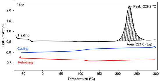 To determine the onset and peak temperature of polymerization, the DSC technique was selected. The measurements were performed using the DSC 204 F1 Phoenix differential calorimeter (Netzsch GmbH, Selb, Germany). All samples were analyzed in the temperature range of −60–300 °C, at a heating/cooling rate of 10 °C/min under nitrogen atmosphere. After the first heating, the samples were cooled and then reheated to ensure that the polymerization was complete and no additional heat effects were observed.