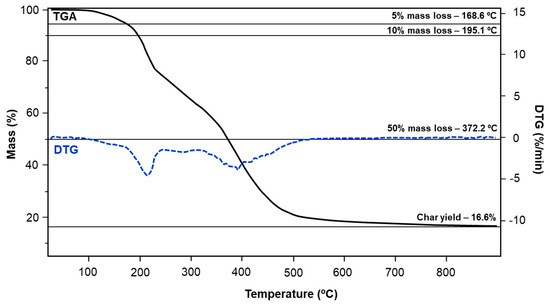 The TGA curves recorded for all samples indicate mass loss of approx. 5% in the relatively broad range between 145 °C for pC-pT and up to 190 °C for mC-pT. The temperature range at which the mass loss is equal to 10% is slightly narrower and starts at ca. 180 °C (pC-pT) with the finish at ~209 °C for mC-pT. The remaining samples lost 10% of mass in the middle of the aforementioned temperature range. More significant differences between the samples were observed as the temperature increased. Benzoxazines based on m-cresol and p-cresol lost 50% of the sample mass at the temperature over 340 °C, while for oC-A and oC-pT, half of the mass already disappeared at approx. 240 °C. The benzoxazines based on m-cresol—mC-A and mC-pT—exhibited the highest residual mass (approx. 20%) after the analysis. TGA and DTG curves recorded for pC-A benzoxazine are presented in Figure 10. All characteristic data collected for the analyzed benzoxazines are summarized in Table 6.