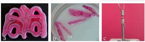 Sample preparation: (a) Detail of the crown’s cross section Shift reagent stained. Please note that this staining bonds the organic component highlighting the areas made up of dentin; (b) Dentine bars, size 2 × 2 × 8mm. (c) Sample mounted on the traction machine.