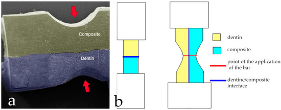 Notches creation: (a) The red arrows indicate the pre-crack areas; (b) Comparison between Conventional Test and bi-material Curved Test. In Curved Test, notches (created both on the dentine and composite sides) will be the pre-cracks from which the two fracture lines originate.