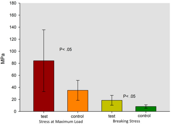 The graph shows the values of the two groups at Breaking Stress and at Maximum Load Stress.
