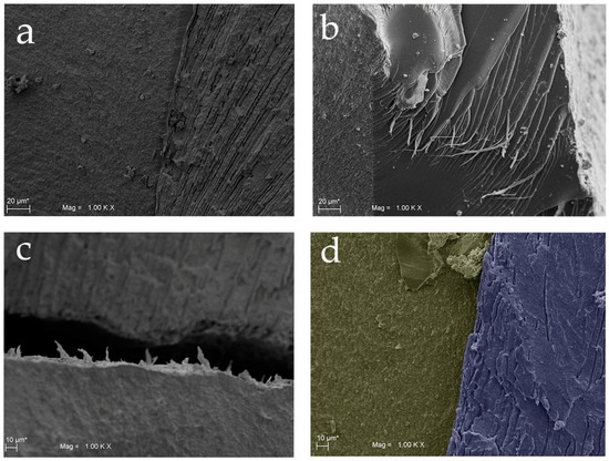 Data obtained from tensile stress at maximum load tests were 84.300 ± 51.342 MPa for the Test Group and 35.071 ± 16.609 MPa for the control group. The statistical analysis, performed with t-test for independent samples, showed statistically significant differences between the two groups (p = 0.033) for this parameter. On the other hand, data obtained from the fracture stress test showed values of 18.543 ± 8.145 MPa for test group and 8.186 ± 2.833 MPa for control group. A statistically significant differences between the two groups (p = 0.008) was shown also in this test. These data are shown in Figure 3 where the mechanical characteristics of the fracture in the different layers, composite, adhesive, and dentin of both groups are indicated. Moreover, the results were confirmed also by SEM analysis, as shown in Figure 4 and Figure 5. Scanning electron microscopy analysis was performed at different magnifications, both for test and control samples. in Figure 4, it is possible to observe the surface microstructure of the test samples at different magnifications. It is clearly shown that no detachment occurred at the interface between the adhesive and the dentine. In addition, the SEM analysis demonstrated that the fracture involved the dentine was irregular, while, in the composite, the trend was more regular (Figure 4 and Figure 5). At the interface of test samples, there were no detachments shown and the contribution of the micro roughness induced by sandblasting appeared evident, as shown in Figure 4 and Figure 5. In particular, Figure 5b shows the layer of adhesive at 1.00 K magnification where the Hackle lines were evident, showing a sign of a fragile fracture in the layer of the adhesive itself, due to the low concentration of filling elements. Moreover, the SEM images of the Control group shown a clear failure at the interface between dentin and adhesive, thus recording a lower resistance to adhesion compared to the Test samples (Figure 4b,d and Figure 5c). On the other hand, Figure 4b showed how in the control samples the fracture involved both dentine and the composite parts. Figure 4d showed the sign of detachment at the interface at greater magnification.