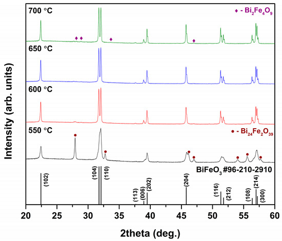 For the synthesis of BFO powders bismuth(III) nitrate pentahydrate (Bi(NO3)3·5H2O, 98%, Roth, Karlsruhe, Germany) and iron(III) nitrate nonahydrate (Fe(NO3)3∙9H2O, ≥ 98%, Alfa Aesar, Haverhill, MA, USA) were used as starting materials. All chemicals and solvents were used without additional purification. Appropriate stoichiometric amounts of metal salts were dissolved in 2-methoxyethanol (C3H8O2, ≥ 99%, Roth, Karlsruhe, Germany) resulting in a 0.5 M solution of total metal ions. The obtained solution was mixed on magnetic stirrer at 60 °C for 1 h. Next, organic solvent was evaporated under constant stirring at 130 °C and residual substance was dried in the oven at 100 °C overnight. After this, dried brownish precursor powders were ground in an agate mortar and annealed at 550, 600, 650 and 700 °C for 5 h in air with a heating rate of 1 °C/min.